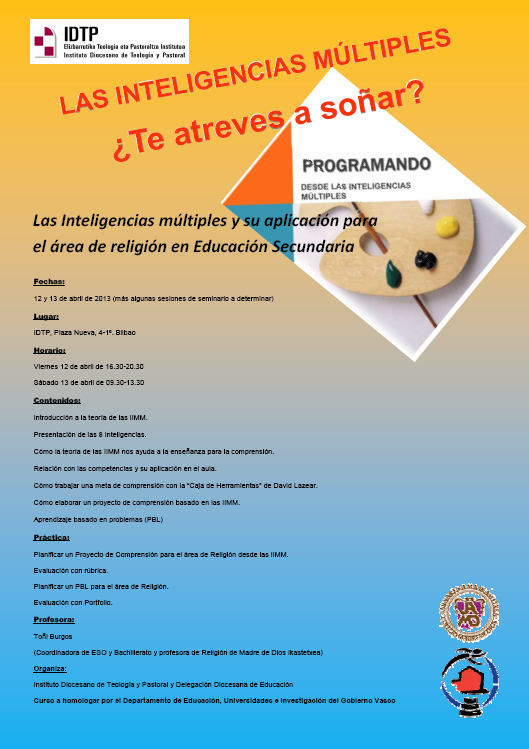 El viernes y sábado 12 y 13 de abril asisitimos al curso sobre inteligencias múltiples impartido por Toñi Burgos, profesora y coordinadora de ESO- Bachillerato y Andoni Salvador, director pedagógico de Madre de Dios Ikastetxea.En el menú de objetivos: